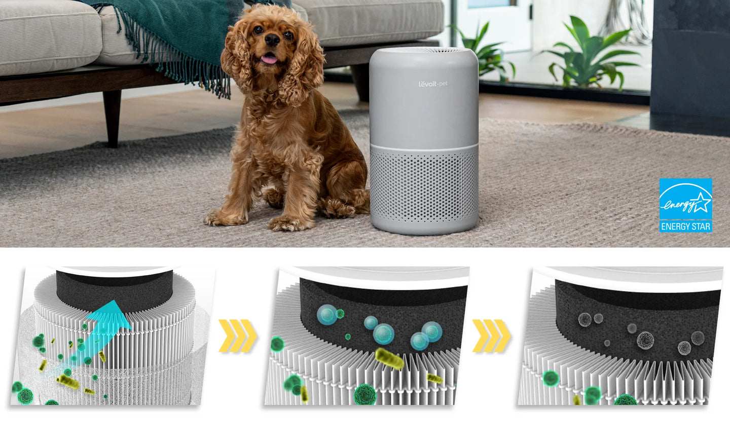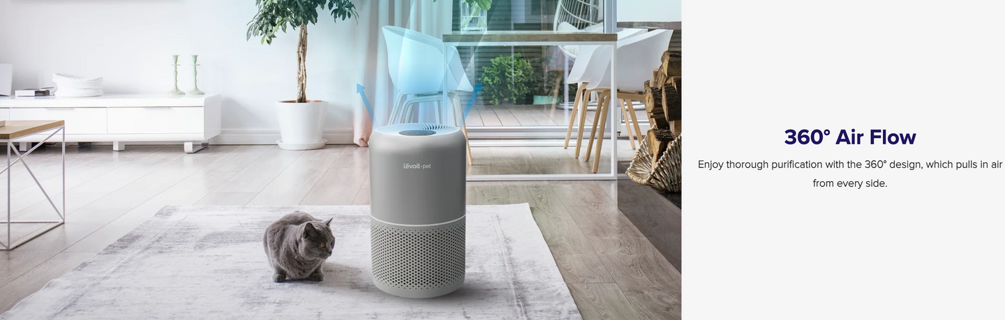The air purifier features 3-stage filtration to reduce the spread of common pet-related allergens and pollutants.