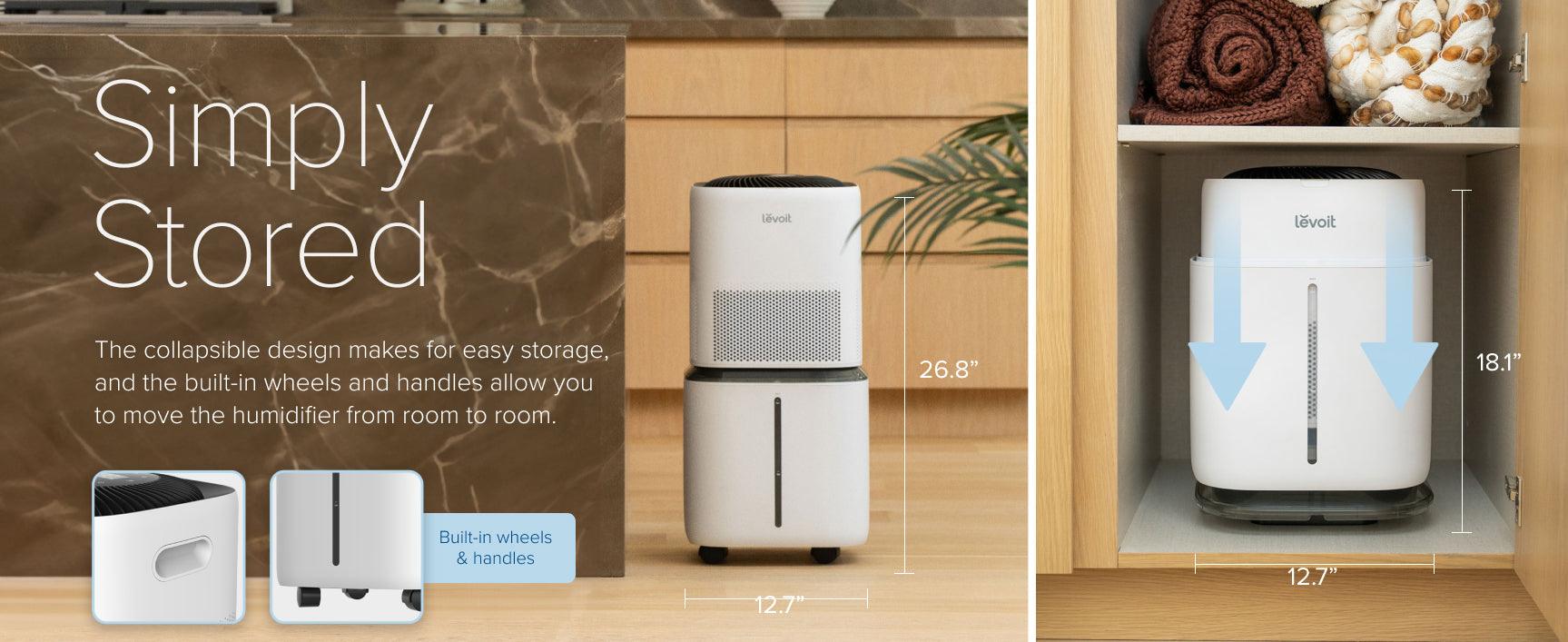 - Easy Storage: The collapsible design and included storage bag make for easy storage, and the built-in wheels and handles allow you to maneuver the humidifier from room to room