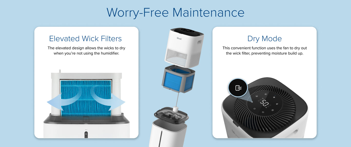 - Dry Mode: Low and high fan speeds dry out the elevated wick filters, extending the filter life