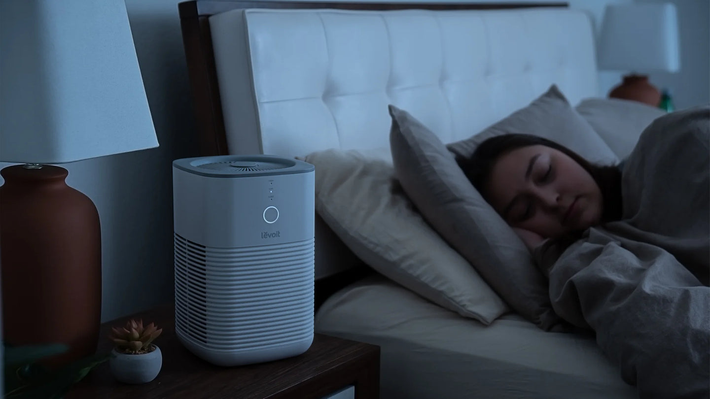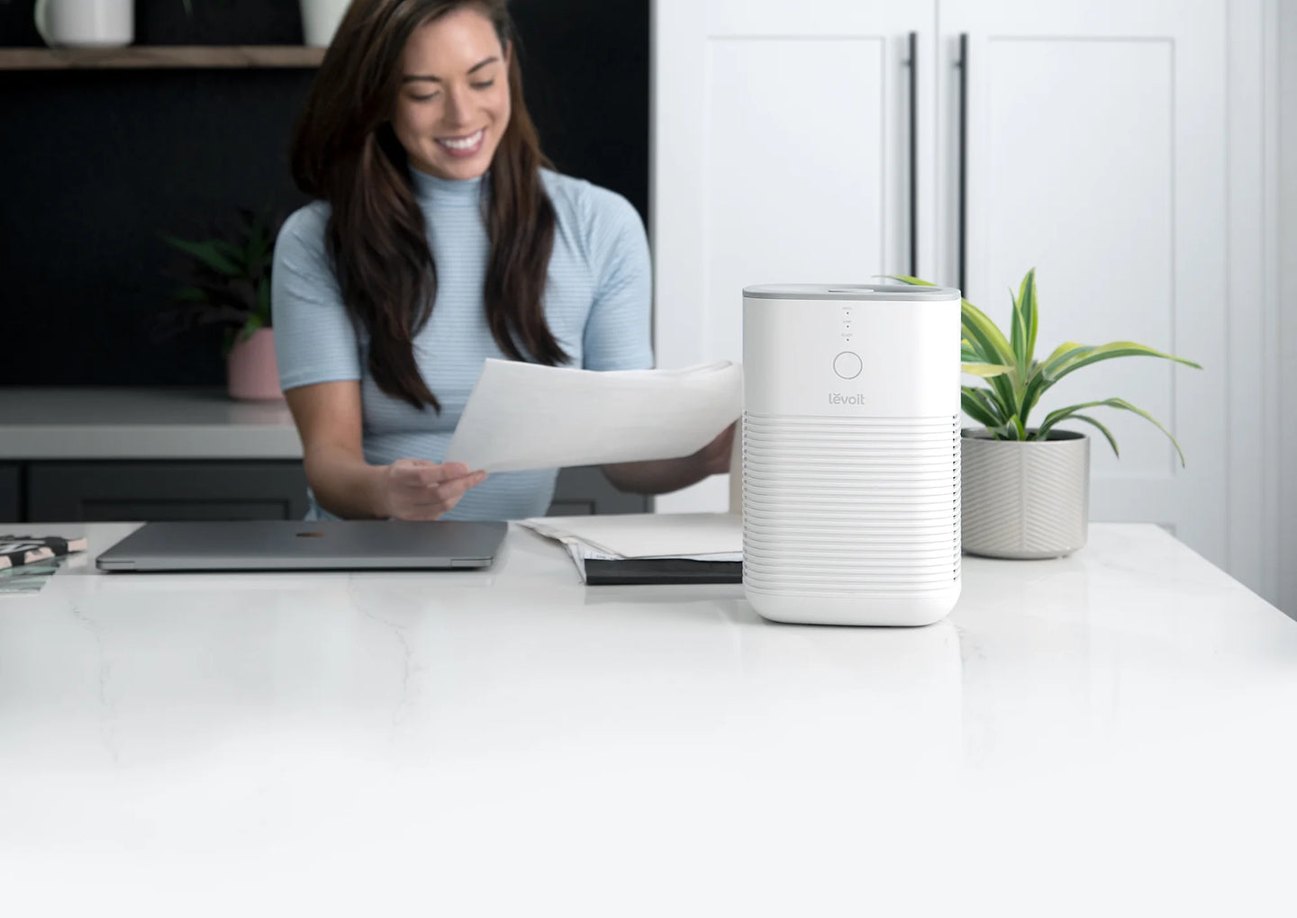 The air purifier's 3-stage filtration traps dust, fumes, and at least 99.97% of airborne particles 0.3 microns in size.